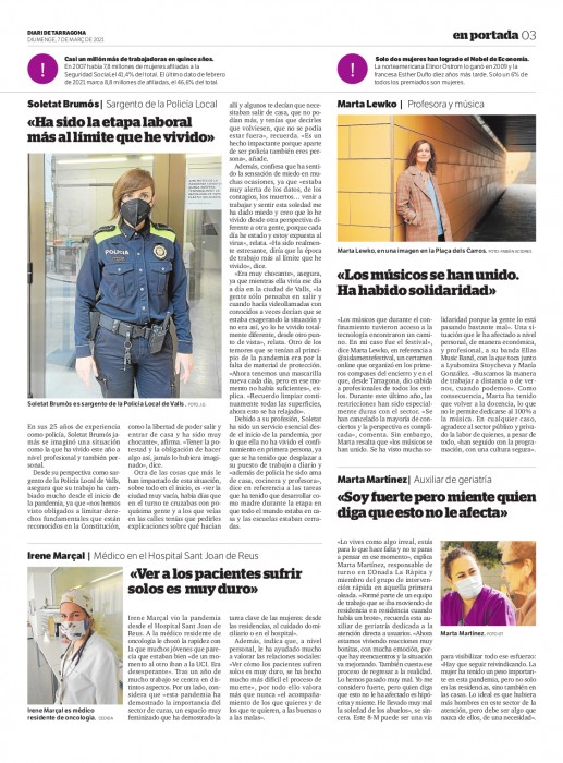 El passat diumenge 7 de març, en el marc del Dia Internacional de la Dona Treballadora, el Diari de Tarragona va dedicar un més que merescut homenatge a totes les dones tarragonines que han estat en primera línia durant l'últim any.