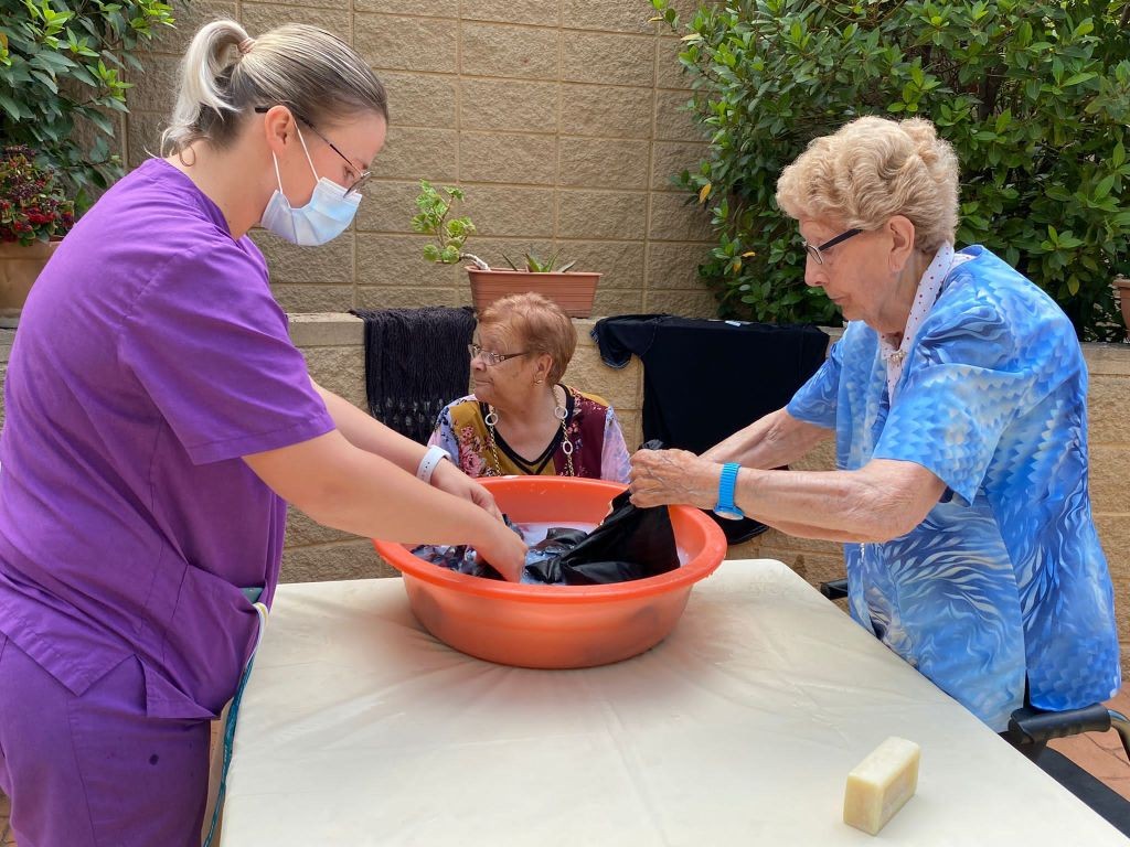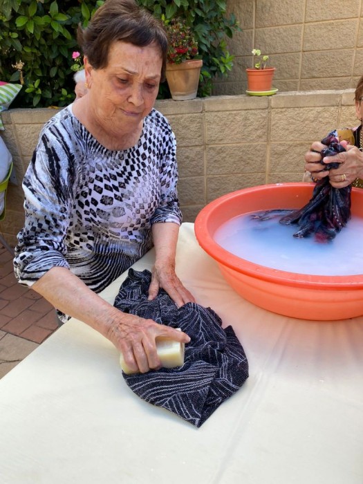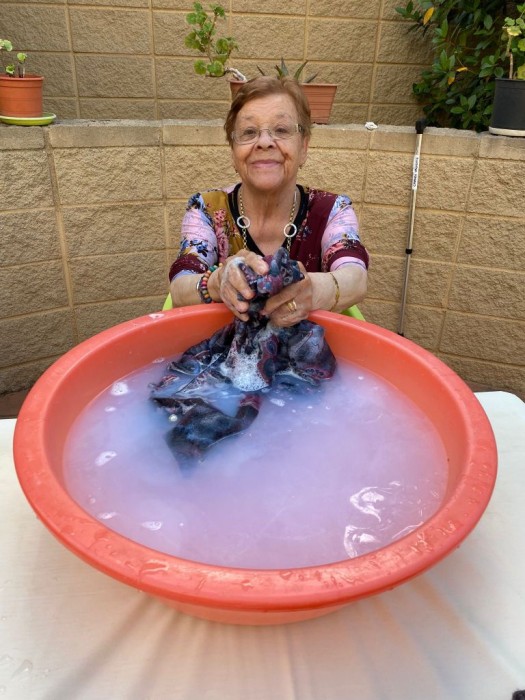Aquesta tarde hem sortit al jardí i hem rentat roba com es feia abans. Amb una pastilla de sabó i un safareig d'aigua, moltes d'elles ens han explicat com es feia, i s'ho han passat moltbé. Mentres, alguna d'elles també ens explicava com anaven a buscar l'aigua i la treien del pou amb un motor de manivel•la i anaven als safarejos... Ha sigut una tarde molt entretinguda i plena de molts records!!