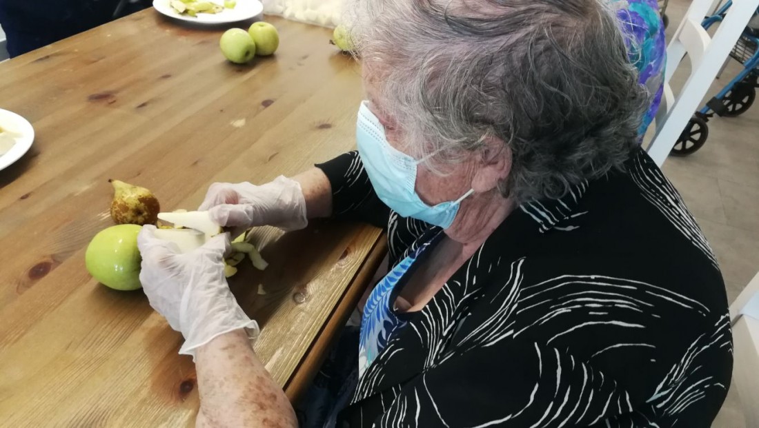 Pelem i tallem la fruita per preparar el berenar. Ens agrada ajudar en tot el que podem!!