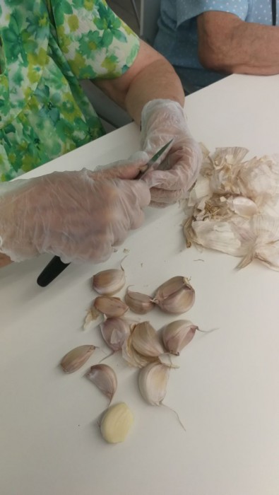 Avui en el taller de cuina, hem estat pelant i tallant alls per preparar el dinar.