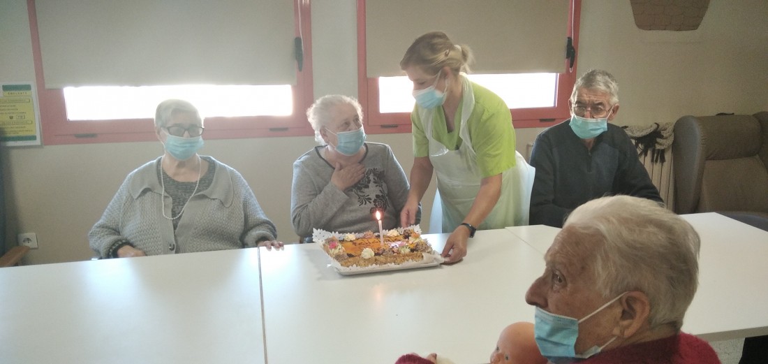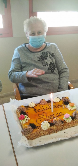 Us compartim les fotos de l'aniversari de la Mercè, que en va celebrar 82! La seva família li ha portat aquest pastís deliciós. Per molts anys!
