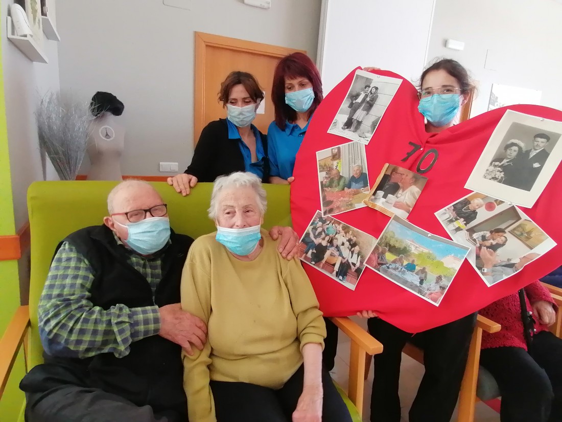 Al centre els hem fet un homenatge, no tothom arriba a complir aquesta fita i amb la salut de ferro que tenen els dos. Ells ens han anat explicant la seva història d'amor, i Emma, la seva RA, l'ha recollit i l'ha escrit per tal de trasmitir-la a tots els companys del centre. La família ha col·laborat aportant fotografies de la seva història per tal de fer-los-hi una sorpresa.