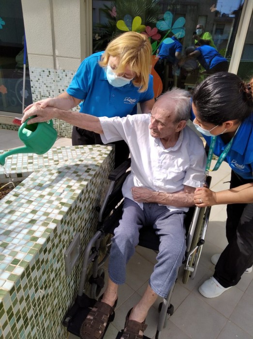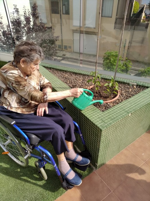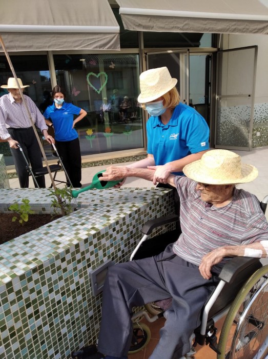 Entre tots cuidem el nostre hort. Avui els usuaris del menjador Coll de l'alba han sortit a la terrassa per regar les hortalisses que hi tenim plantades.