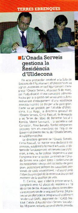 En acte protocolari celebrat a la Sala de Sessions de l’Ajuntament i l’empresa Onada Serveis, el passat 5 març, per l’adjudicació d’una concessió administrativa per a la gestió del servei amb subministrament d’equipament d’una residència asistida i centre de dia per a la gent gran. La directora general de l’Onada Serveis, M.Cinta Pascual, va marcar una declaració de principis, establint la forma d’actuació, els sistema de funcionament i els serveis que s’oferiran, a més, va remarcar l’experiència que l’empresa té en el sector. El centre comptarà amb 42 places de residencia i 18 de centre de dia. N’hi hauran places públiques i privades.