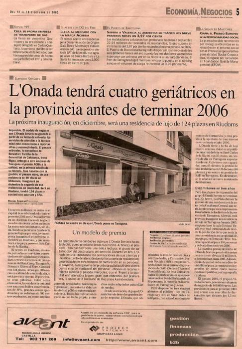 Próxima inauguración de l’Onada Serveis a Ulldecona. Dicha residencia contará con elementos de SPA, grandes zonas ajardinadas y un solarium de 300 m2, amplias zonas de actividades, fisioterapia y gimnasio. Todas las habitaciones cuentan con baño propio, y muchas están adaptadas para sillas de ruedas. Desde su creación, l’Onada Serveis tiene dos grandes áreas de negocio: l’Onada que administra la red de residencias y centros de día, y Formació i Serveis Socials (FiSS), empresa especializada en la formación y servicios de SAD (Servei d’Atenció Domiciliaría). FiSS dispone de tres centros abiertos al público. L’Onada tiene a fecha de hoy cuatro centros abiertos. La partida presupuestaria de l’Onada Serveis para todos estos proyectos se eleva a 10 millones, a desembolsar hasta 2006.