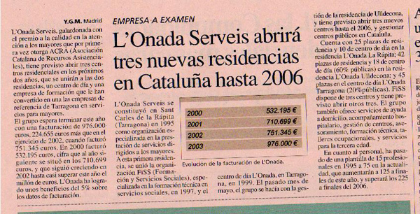 L’Onada galardonada con el premio a la calidad en la atención a sus usuarios otorgado por ACRA, tiene previsto abrir tres centros residenciales de aquí al 2006. El grupo espera alcanzar este año una facturación de 976.000 €. La empresa ha logrado unos beneficios del 5%. Se constituyó en Sant Carles de la Rápita en 1995, a la cual se unió FiSS, especializada en la formación técnica en servicios sociales, en 1997. En el mes de mayo el grupo se hizo con la gestión de la residencia de Ulldecona. El grupo también ofrece servicios de ayuda a domicilio, compañía hospitalaria, gestión de centros, asesoramiento, formación técnica, talleres ocupacionales y servicios para la tercera edad. Cuenta con un plantilla de 75 profesionales aumentada desde 1995 y que espera aumentar a 125 a finales del 2003.
