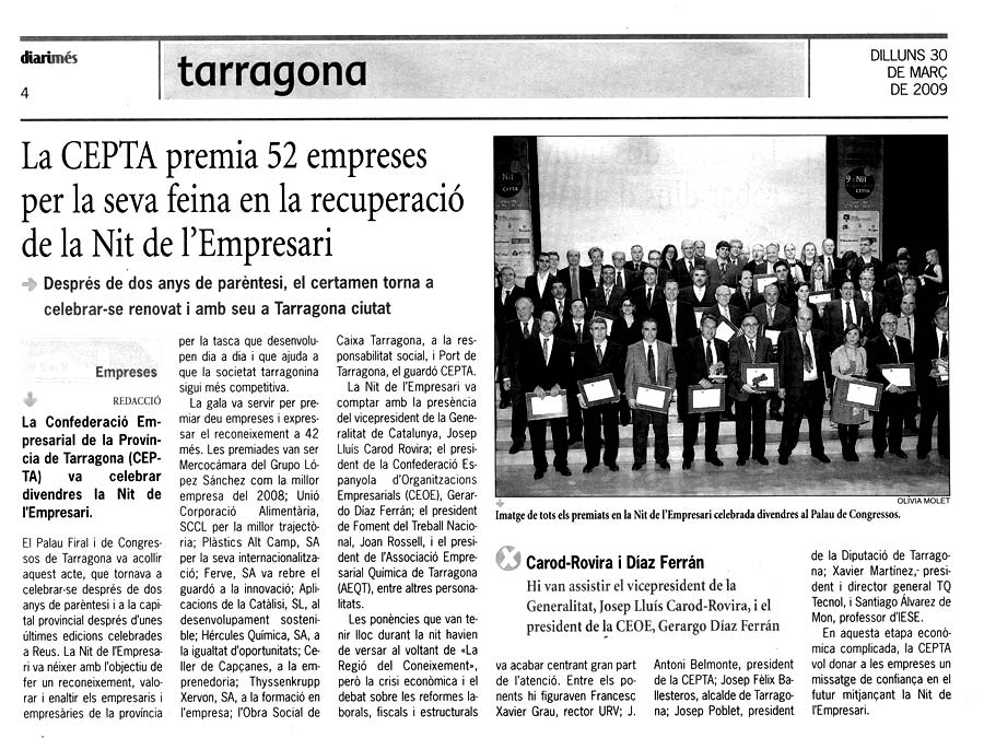 La CEPTA va entregar el passat divendres 27 de març el premi Reconeixement a la responsabilitat social a la residència tercera edat L'Onada