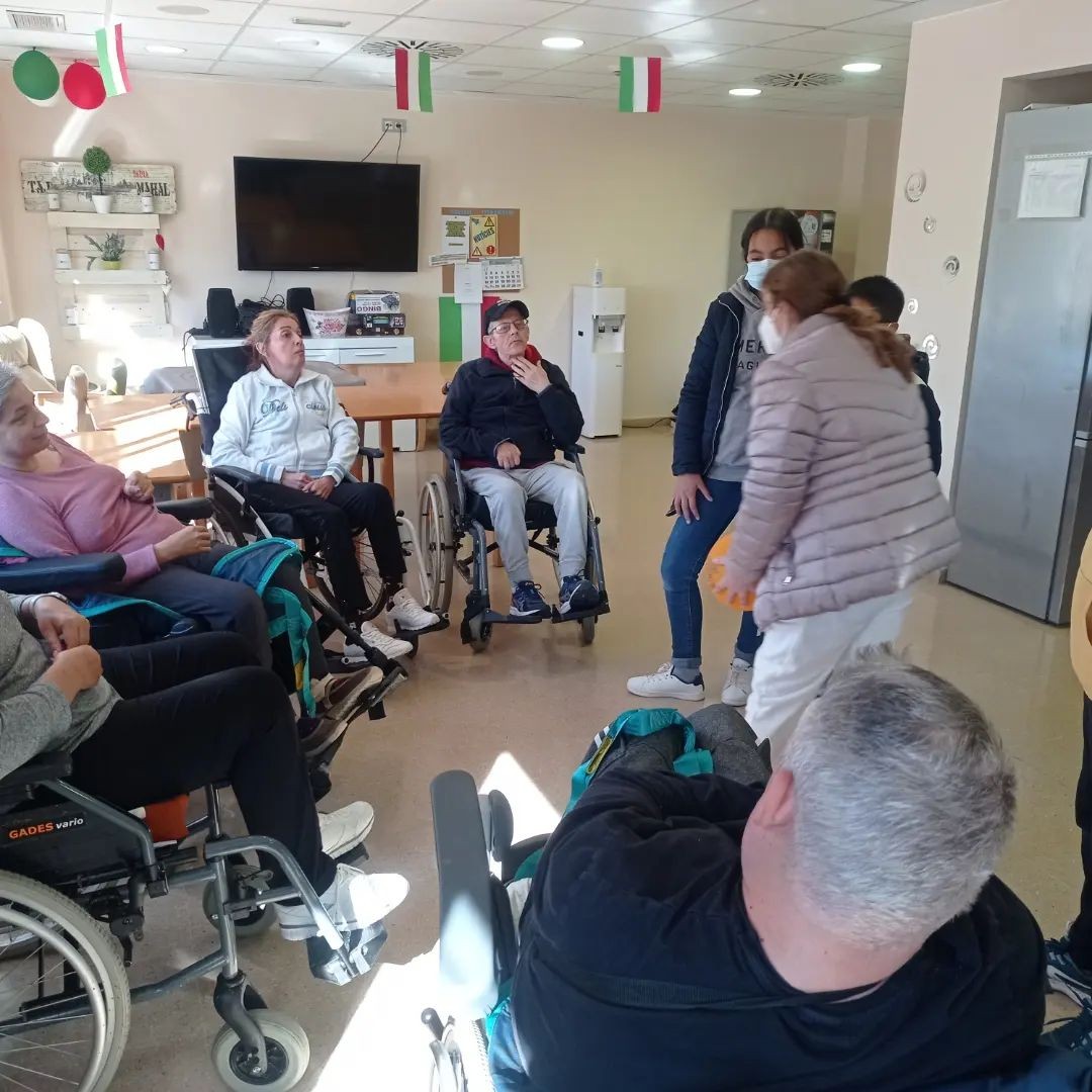 Avui han vingut els nens de l'Escola Sant Jordi i ens hem passat la pilota dient diferents paraules de diferents camps semàntics. Per tant ens hem estimulat a nivell físic i mental.