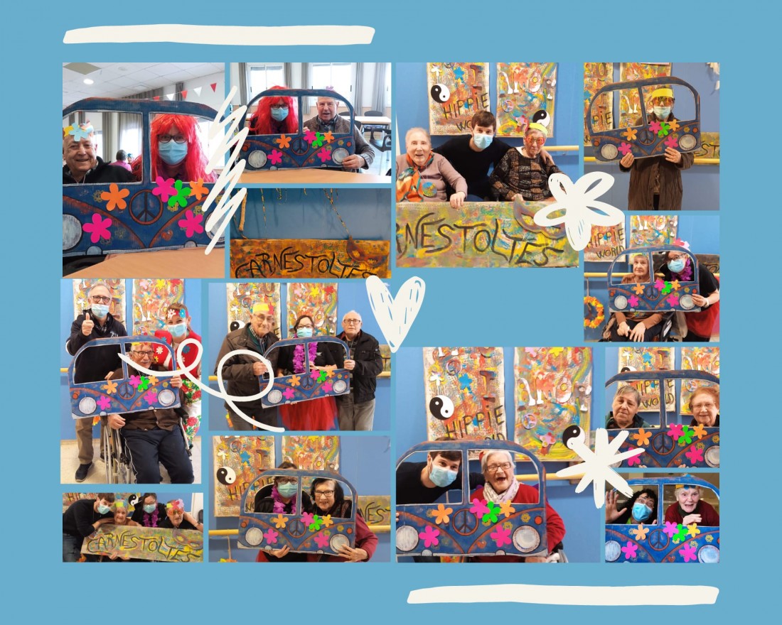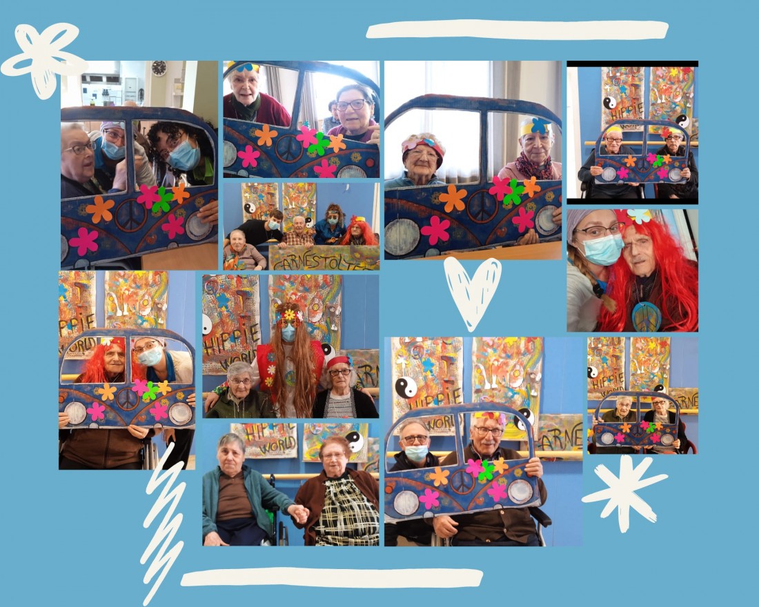 Amb la temàtica "Hippie World", vam disfressar-nos amb corones de flors i collars amb el símbol de la pau, vam escoltar i ballar música dels 70 i vam crear un Photocall amb una wolswaguen que les persones residents i del Centre de Dia van ajudar a decorar. Una wolswaguen que ens va fer viatjar a través dels seus somriures a un món meravellos d'amor i d'afecte, de diversió i xalera, de companyia i co-creació.