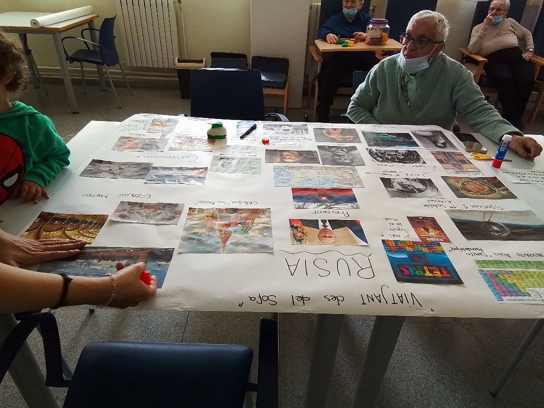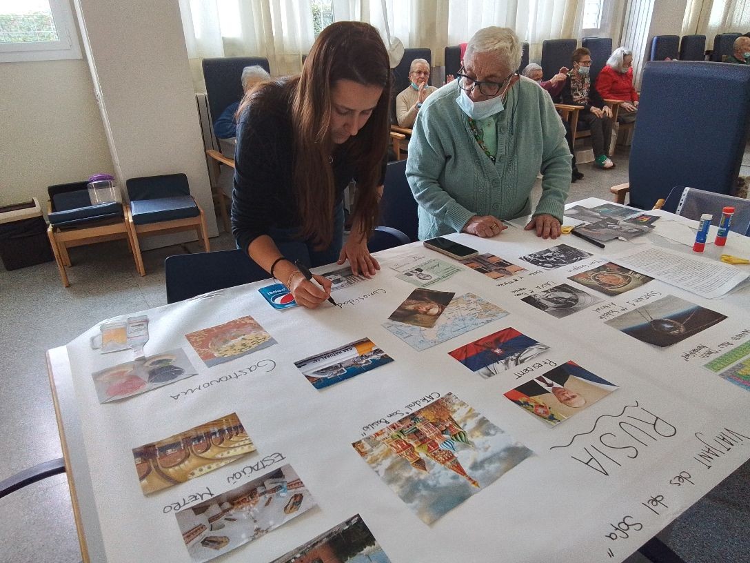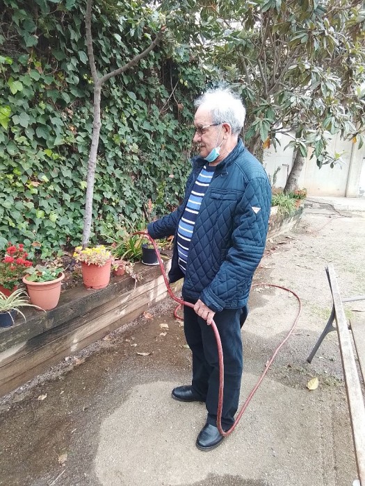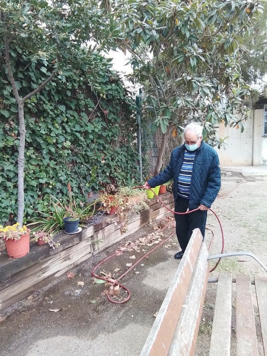 Actividades fuera y dentro del centro. José María regando las plantas y Pepi recortando y pegando fotos para el mural Viajando desde el Sofá.