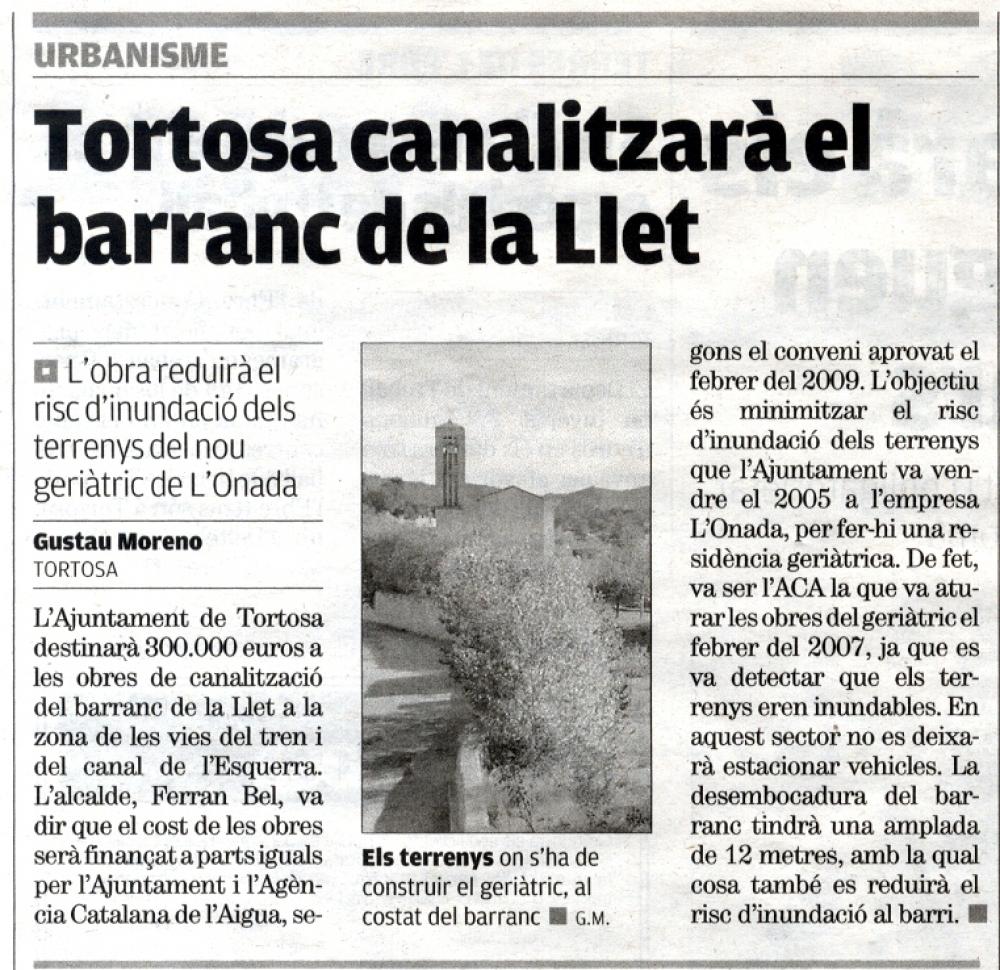 Tortosa canalitzarà el barranc de la Llet