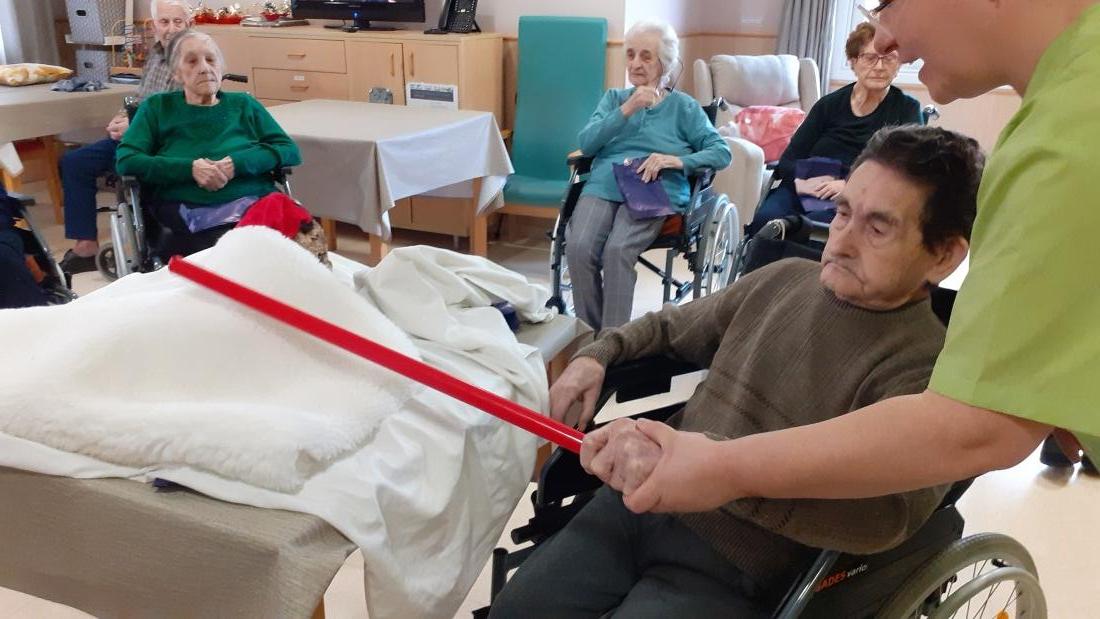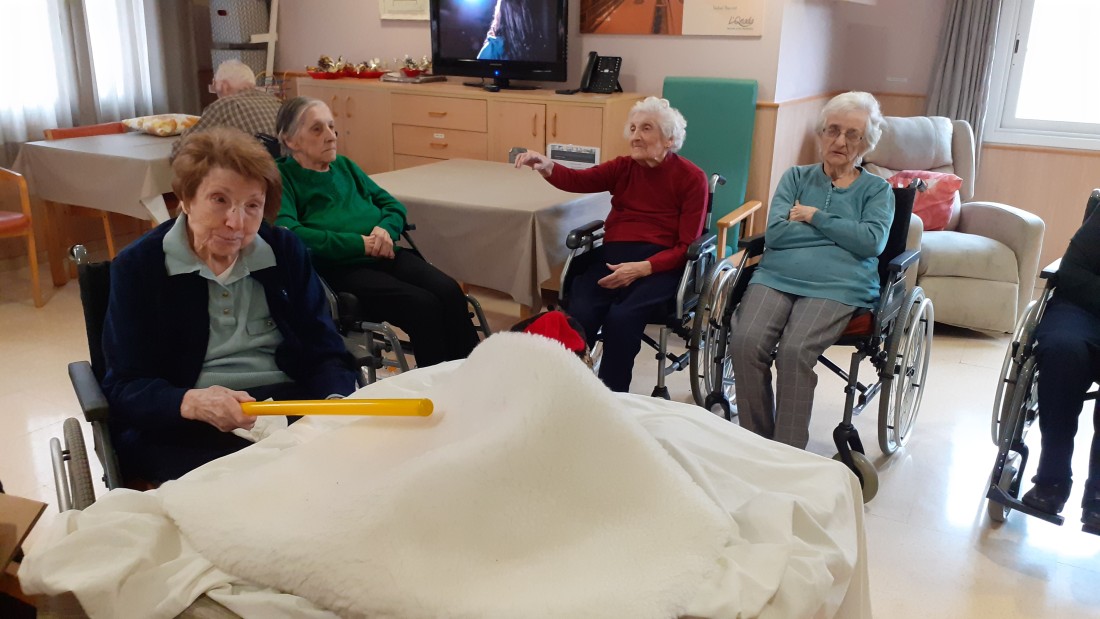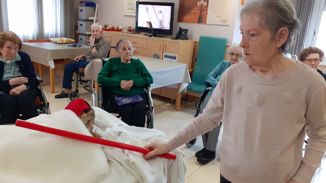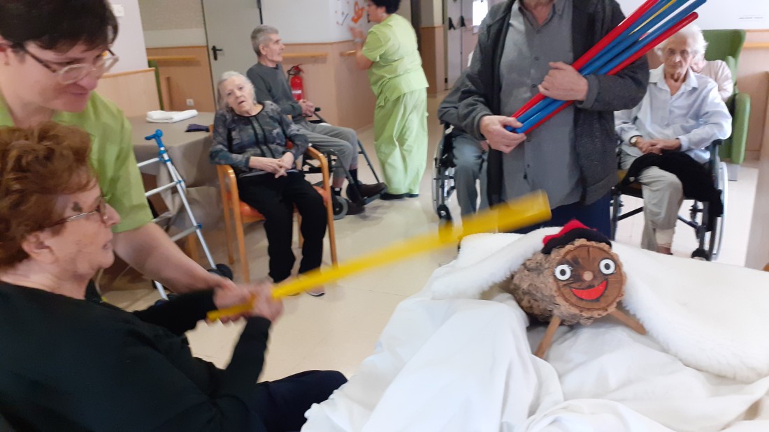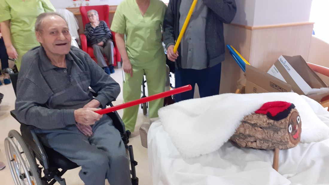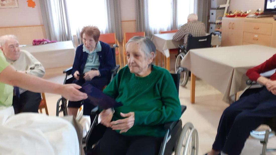 Gracias a que le han pegado fuerte con el palo han salido del tronco unos regalos muy prácticos para los residentes, pañuelos, gorros y guantes para superar estos días de frío en las salidas al exterior.