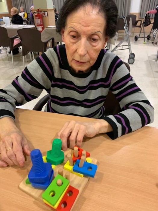 Una de les nostres residents entretenint-se amb aquests exercicis. La psicomotricitat fina és aquella on treballem diferentes tasques i activitats que fem amb les nostres mans. Gràcies a ella podem desenvolupar diferentes habilitats de prescició i de coordinació de diferents parts del nostre cos.