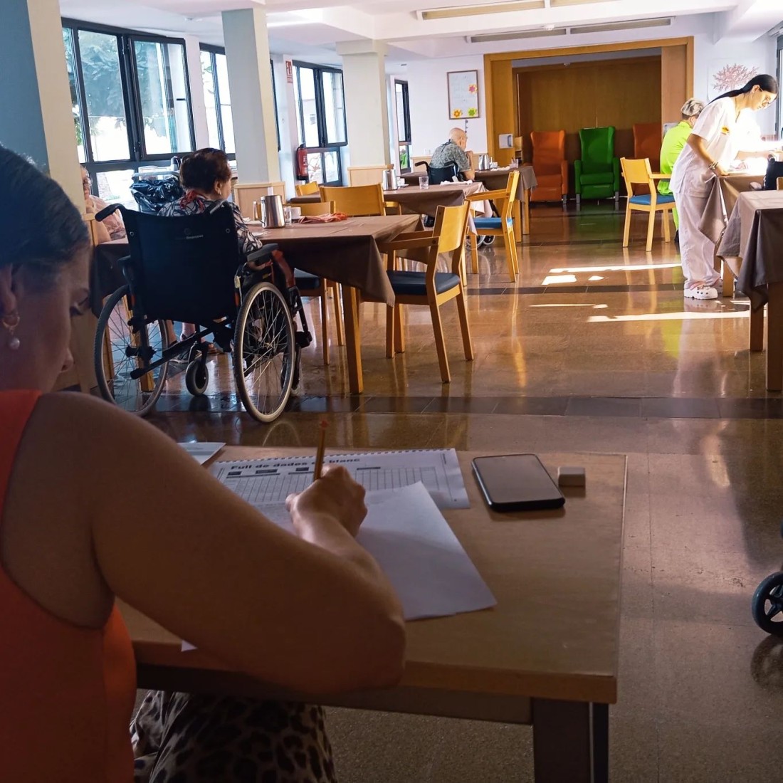 Aquest matí la nostra directora Marta està utilitzant el mètode de Dementia Care Mapping (DCM). Aquest mètode s'utilitza per poder adaptar la nostra feina a les necessitats dels residents quan ells no poden expressar-se de forma clara. Amb l'observació podem arribar a entendre'ls millor i fer plans individualitzats adaptats a ells.