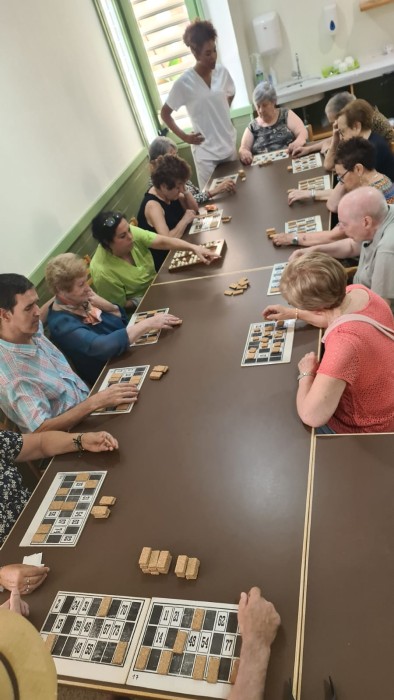 En el Centre de dia, fan una partida de Bingo i alguns usuaris estan molt enfeinats pintant peixos per acabar el mural de l'estiu que han anat treballant.