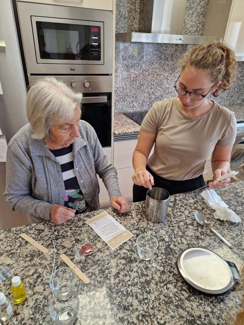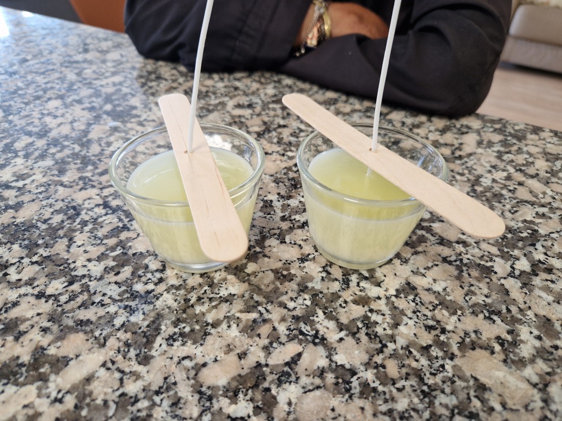 Avui ens ve la Claudia a ensenyar-nos com es fan espelmes. Olorem, les diferents olors: lavanda, fresa i nata, i taronja i canela. Nosaltres fem les espelmes de l'olor de fresa i nata.