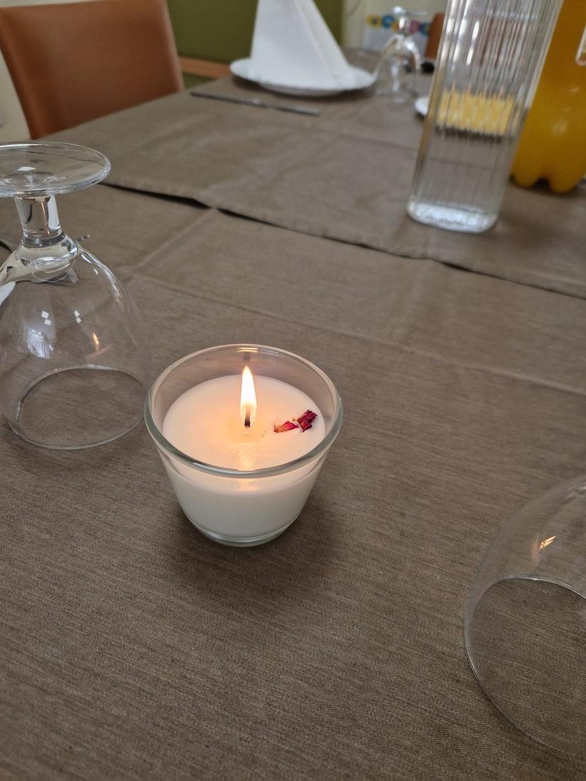 Dinar amb les families. Encetem l'espelma que vam fer l'altre dia, olor a fresa i nata