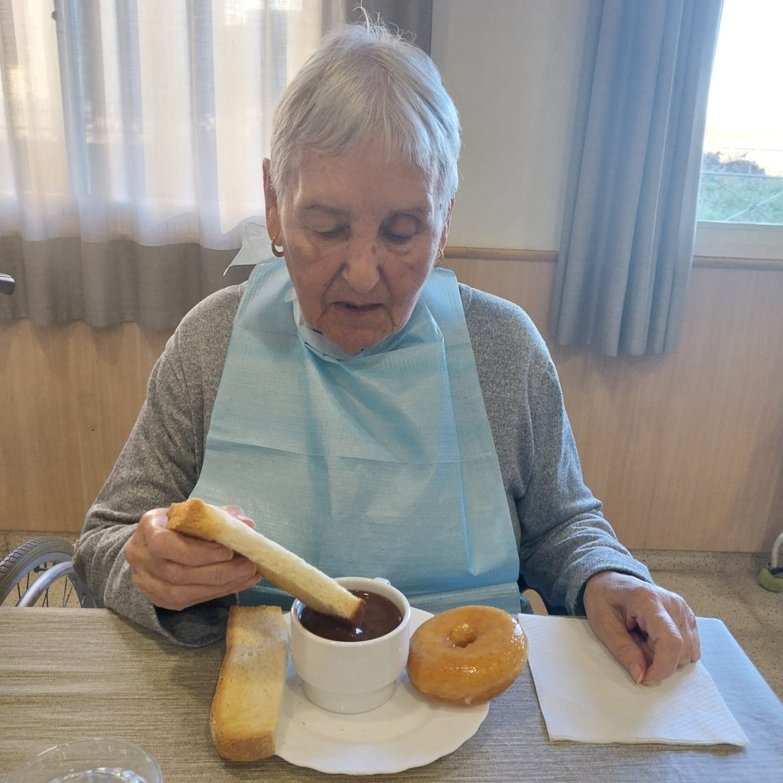 Xocolata a la tassa amb pa torrat i dònut.