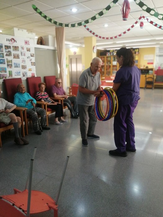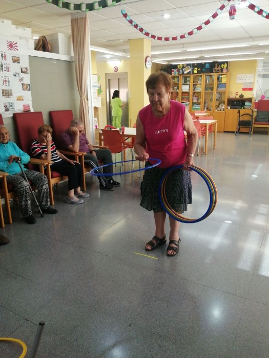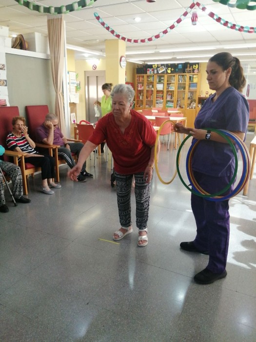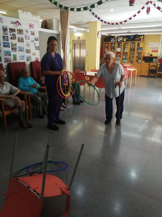 Hoy en la taller físico funcional realizamos la actividad con aros que consiste en acertamos en un sitio determinado. Esta dinámica lúdica nos permite trabajar la coordinación motriz, el equilibrio y la precisión en los movimientos.