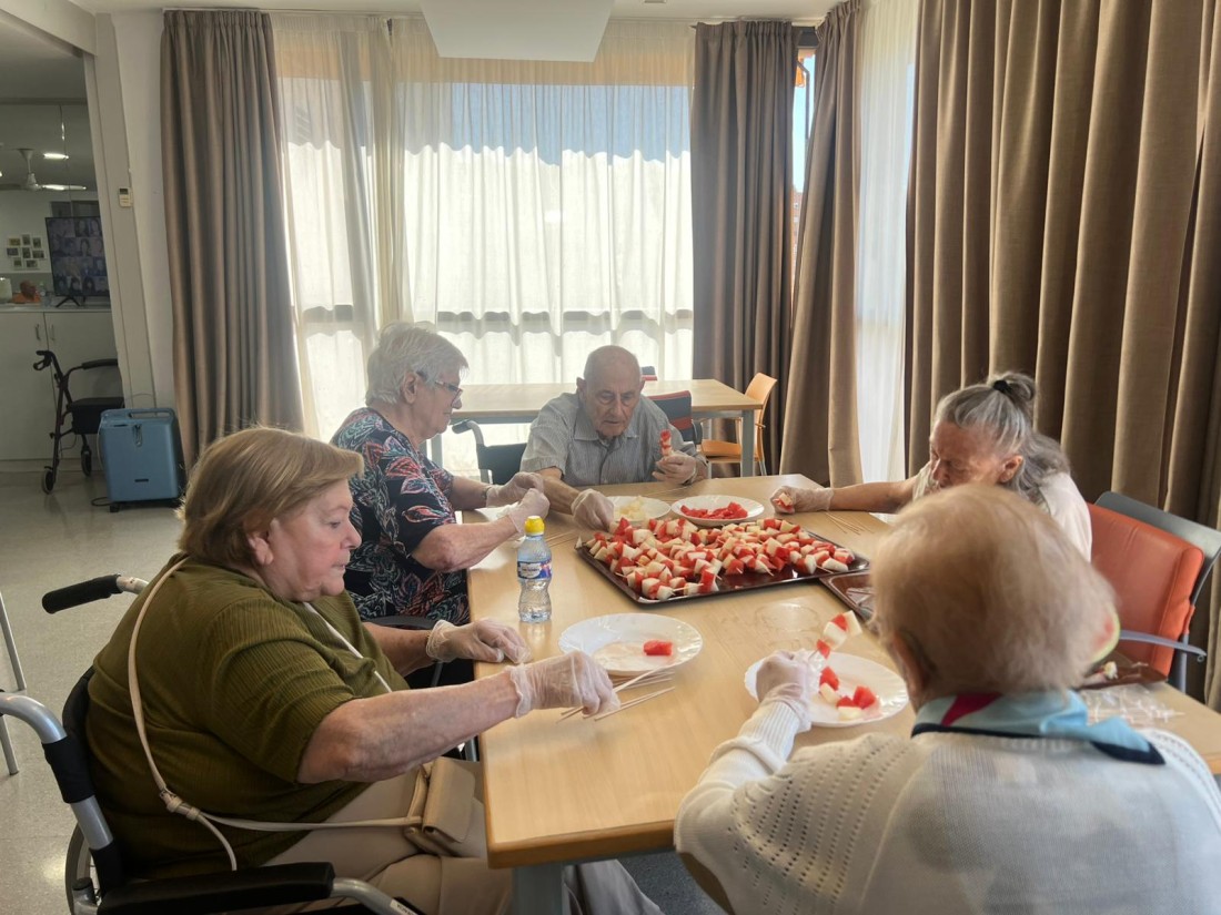 Avui hem gaudit d’un taller molt especial: hem preparat uns pinxos de síndria i meló plens de color i frescor! Els residents han participat activament en la preparació, tallant la fruita i creant combinacions divertides i ben bones.