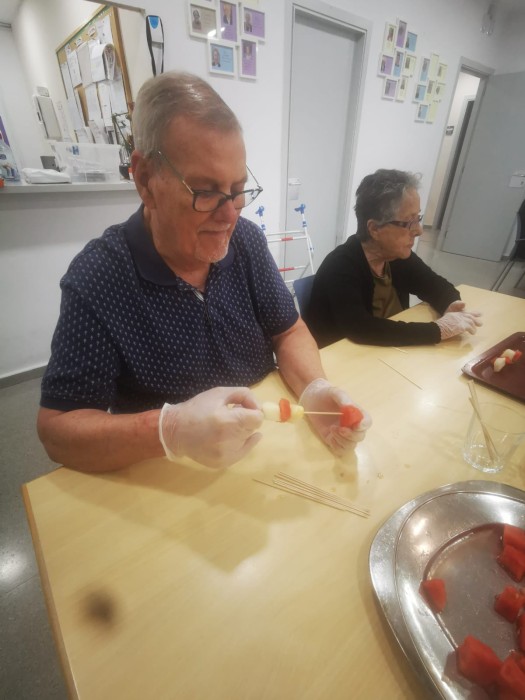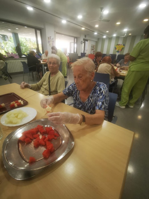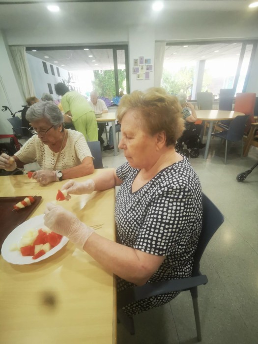 Al centre de dia hem gaudit d’un taller molt especial: hem preparat uns pinxos de síndria i meló plens de color i frescor! Els residents han participat activament en la preparació, tallant la fruita i creant combinacions divertides i ben bones.