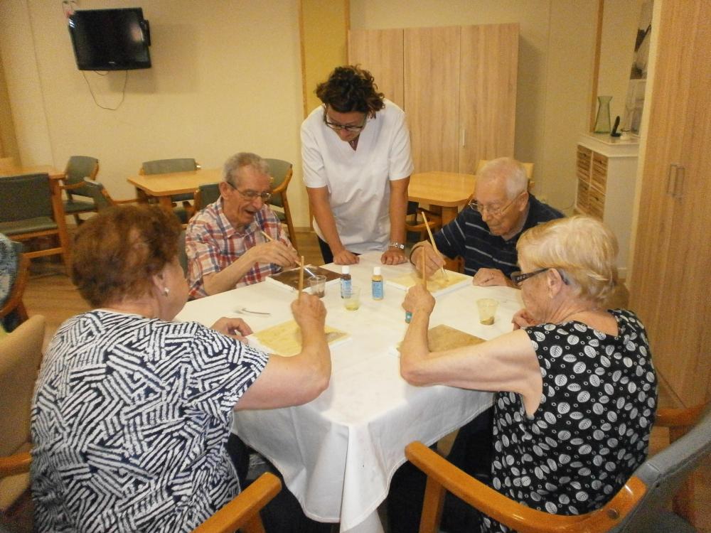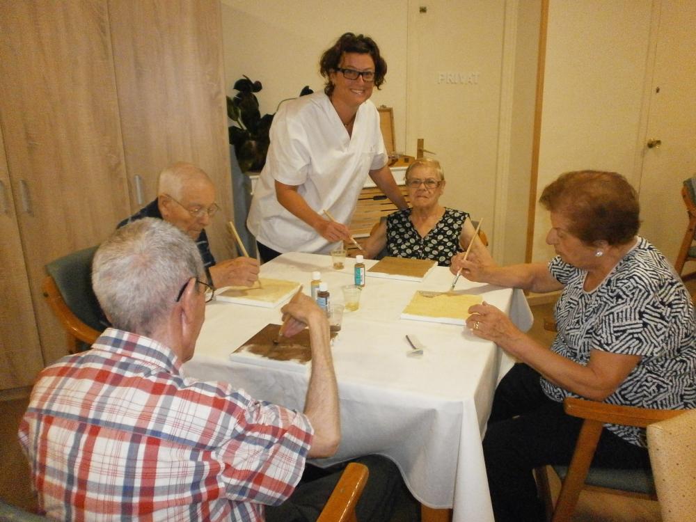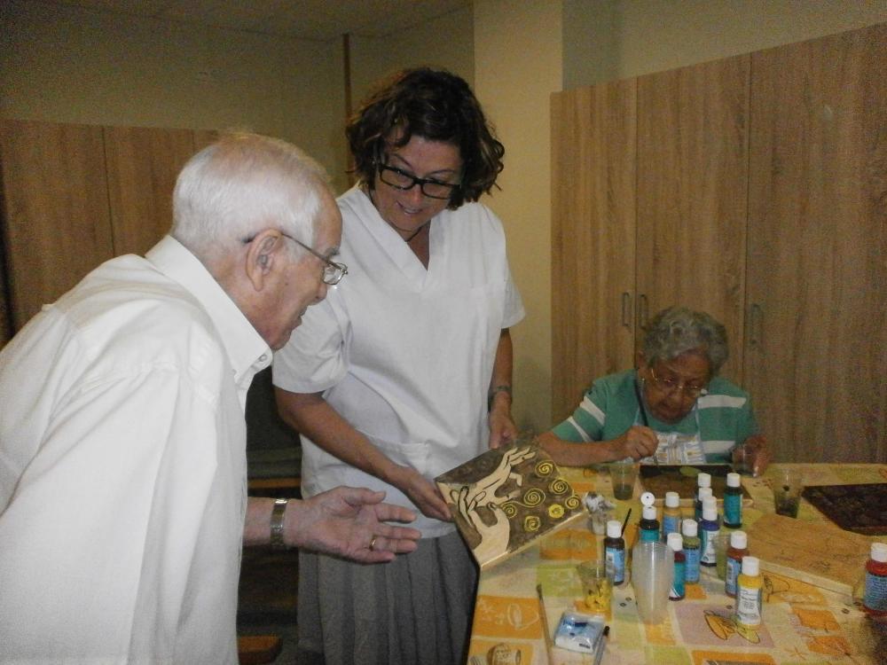 Estem preparant uns quadres molt bonics pel menjador. A alguns dels nostres usuaris, que havien tingut la pintura com a afició, aquesta experiència els ha permès recuperar molts records, així com compartir les seves vivències amb els companys. També estem aprenent noves tècniques artístiques.