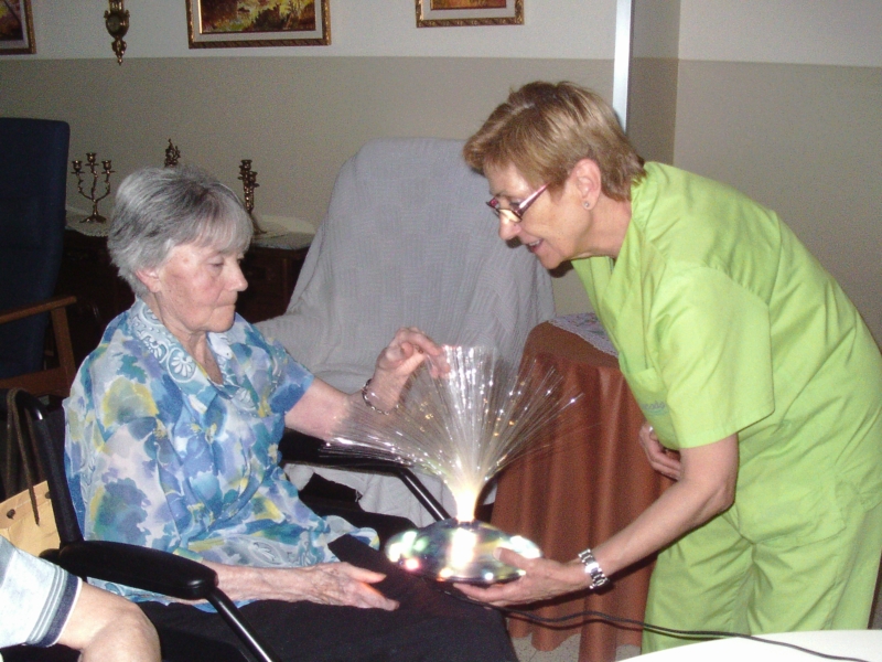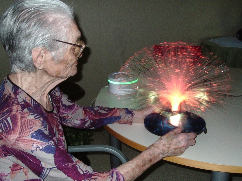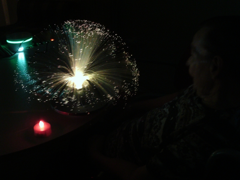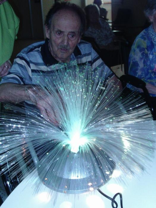 Els jocs de llums, colors i formes ens ajuden a experimentar tot estimulant el sentit visual. D'aquesta manera intentem crear un entorn agradable ajudant-nos de música relaxant i essències aromàtiques per tal de fer el taller el més agradable possible i aportar un estat benefició als nostres residents.
