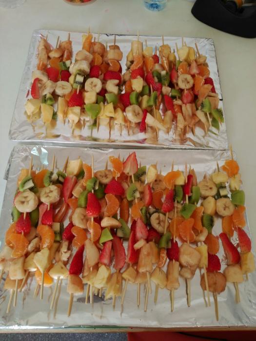 Aquests dies estem de cuinetes! La setmana passada vam fer unes pomes al forn amb canyella molt bones i ahir vam fer uns pintxos de fruita! Postres bons i saludables!