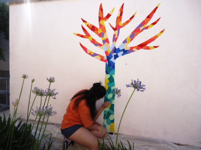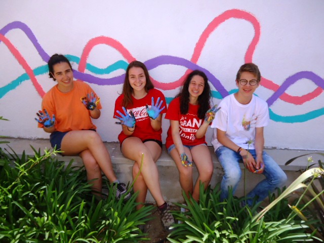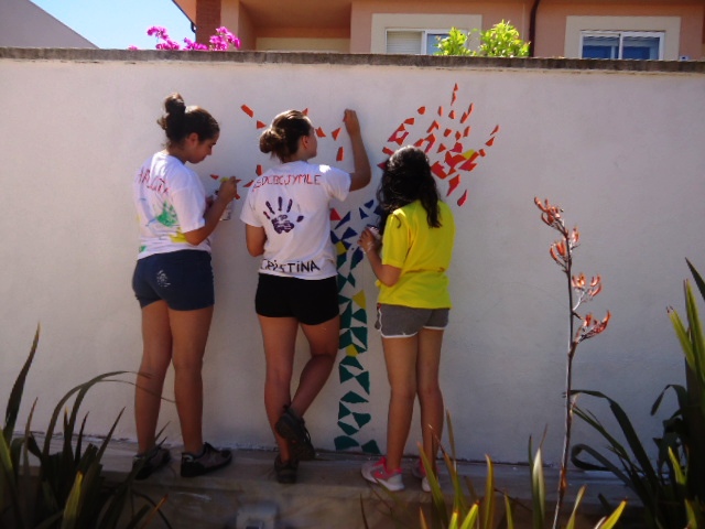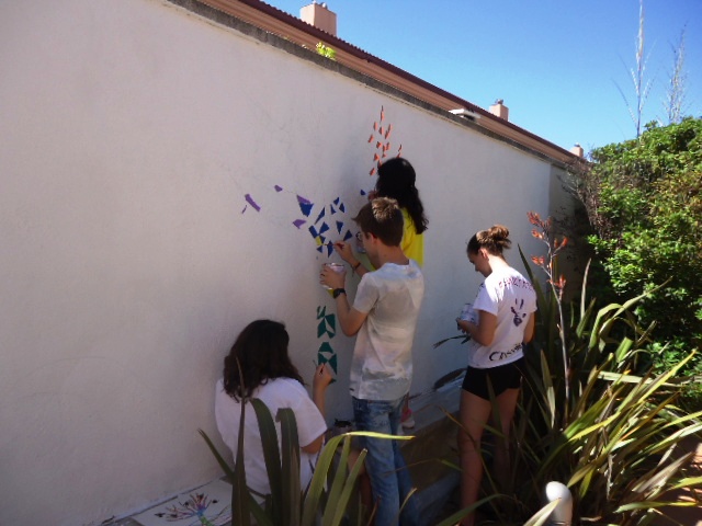 Al llarg de la setmana passada van venir cinc alumnes de 3r d'ESO de l'institut a pintar el dibuix escollit a la paret del jardí del menjador Beat Bonaventura del nostre centre.