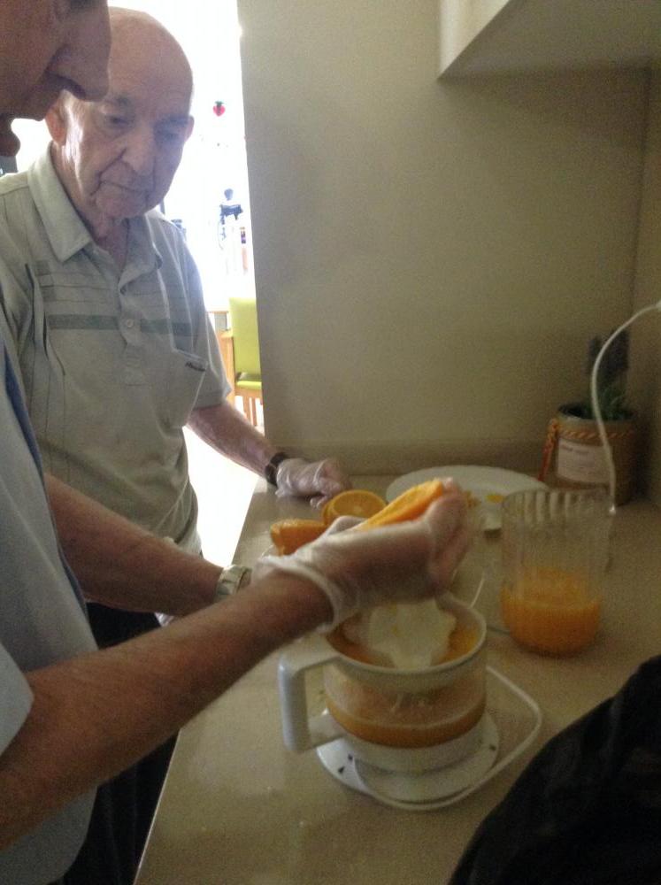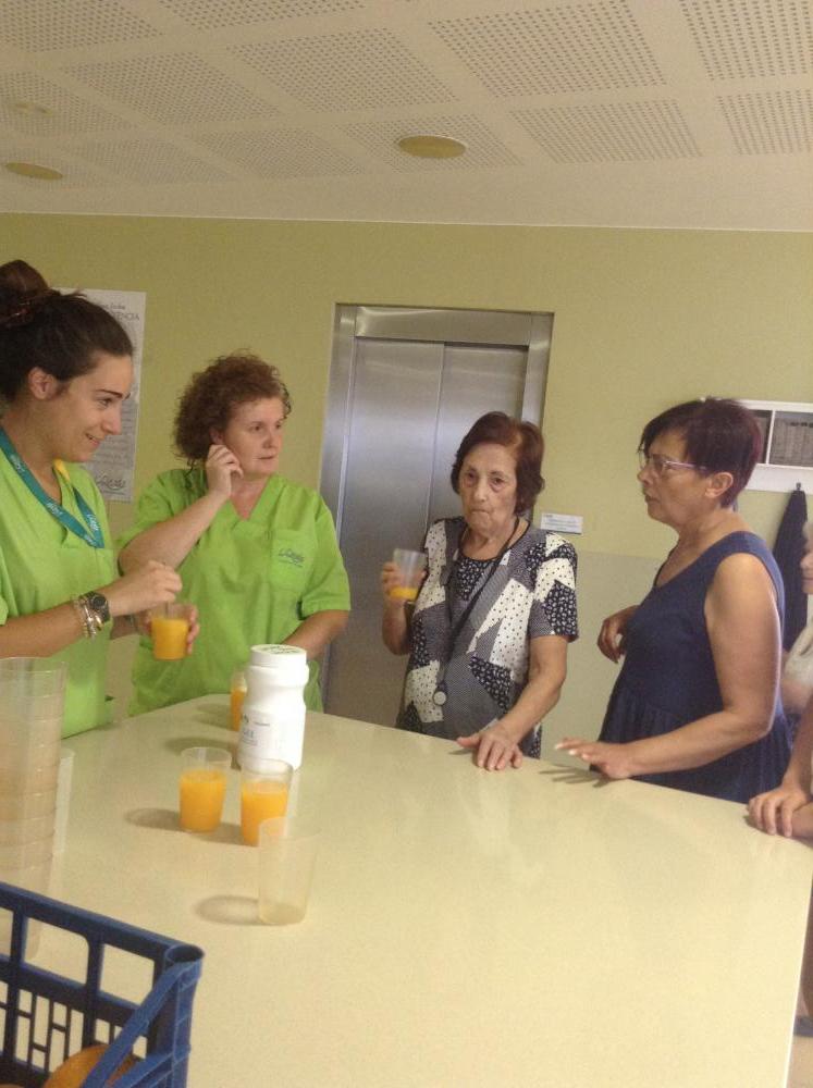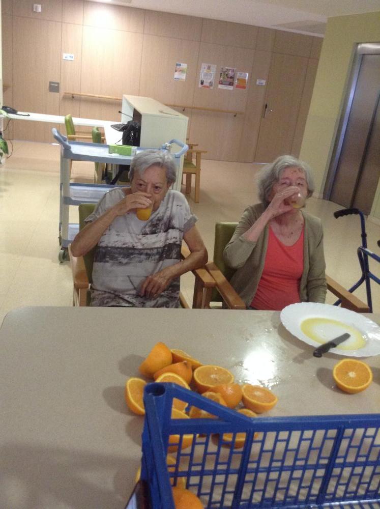 Al menjador de Verema els avis i àvies col·laboren a fer sucs de taronja