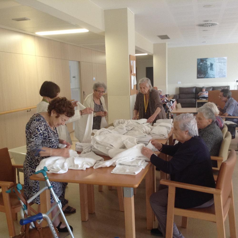 Avui, com quasi cada migdia hem fet taller de bugaderia, on els usuaris participen plegant tovalloles i tovallons.
