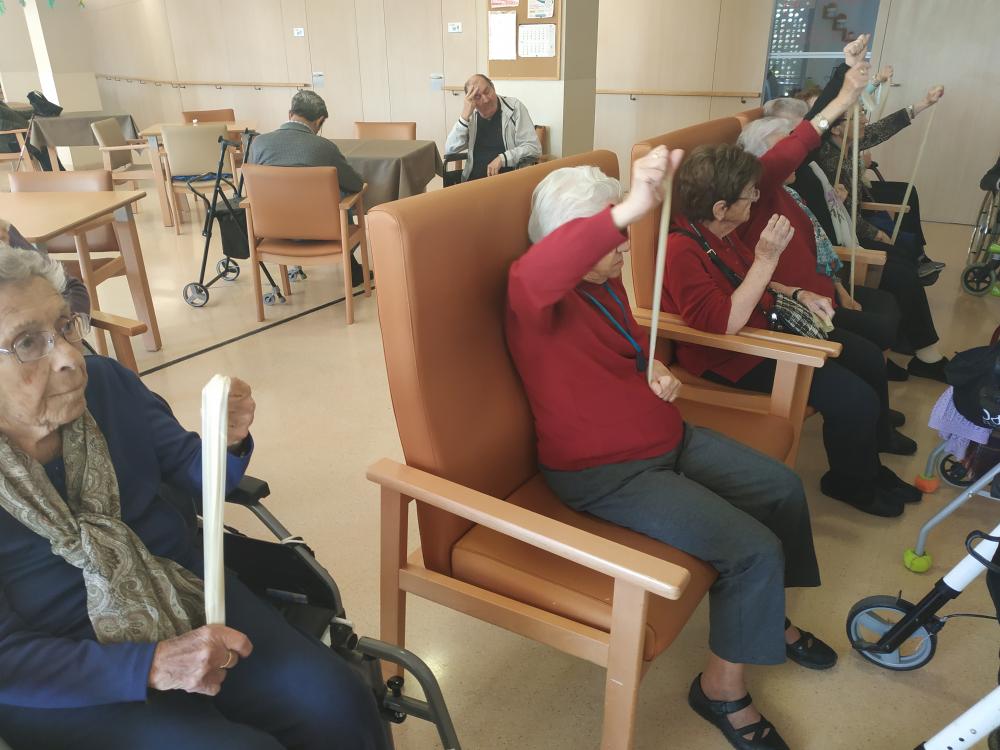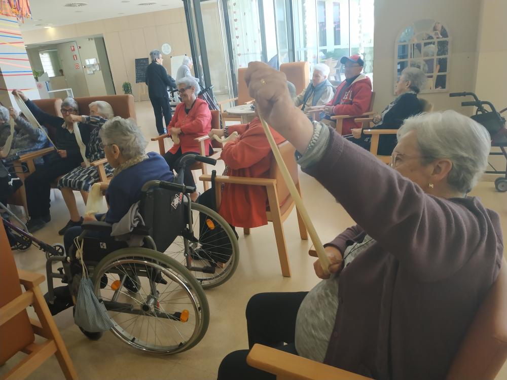 La Terapeuta Ocupacional del centre fa una sessió de potenciació dels membres superiors amb gomes.