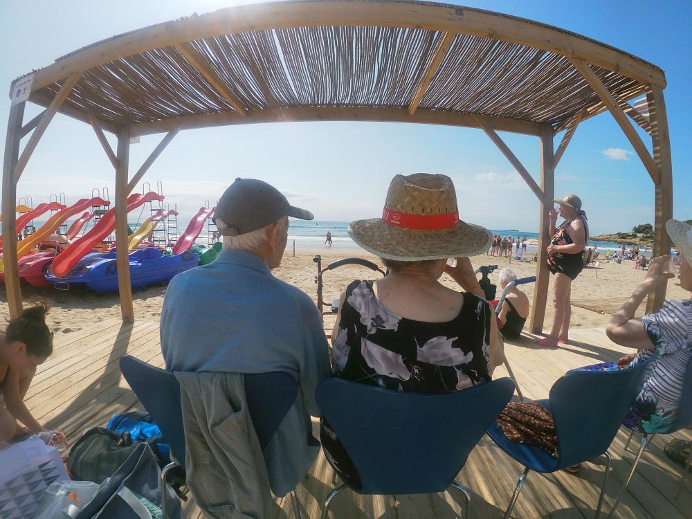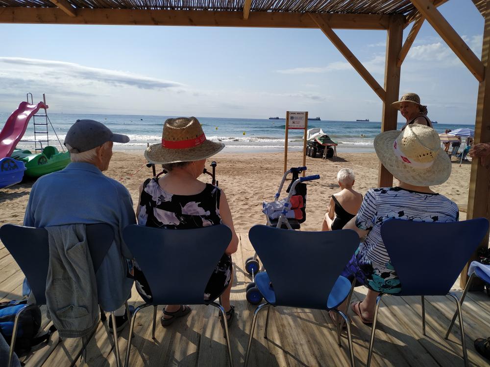 Avui, dimarts 13, hem anat a la platja. Sigui un dia supersticiós o no, la realitat és que aquest matí la bandera ondejava groga i com a conseqüència només ens hem pogut remullar els peus. Però ja diuen que "al mal temps bona cara". Ens hem assegut a la zona adaptada de la creu roja i hem passat una agradable estona contempla'n el mar i compartint anècdotes.