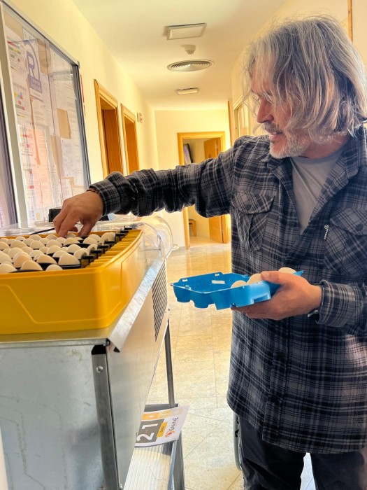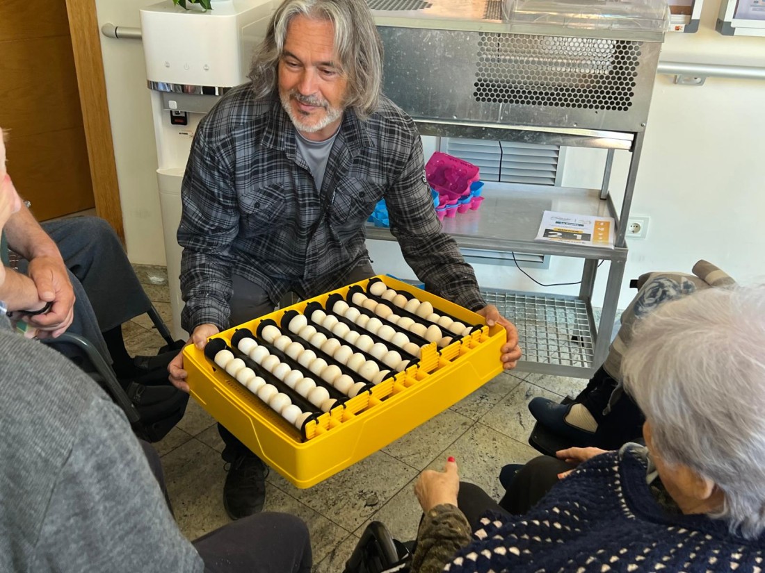 Fue el sábado, día 4 de mayo, cuando se instaló una incubadora con huevos de gallina solariega en su interior. El objetivo es realizar un seguimiento del desarrollo de los polluelos que, después de nacer, estarán varios días en la nacedora, hasta que puedan pasar al gallinero.