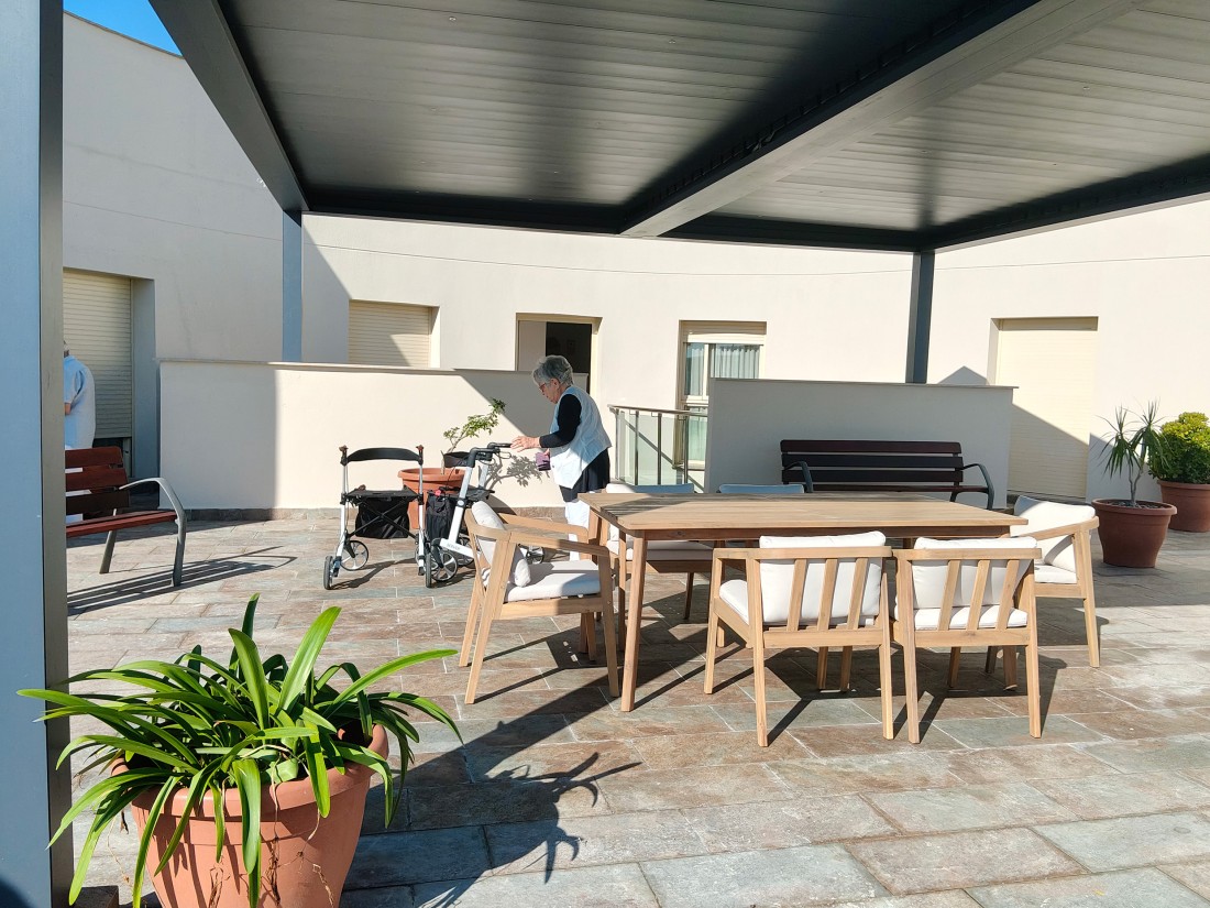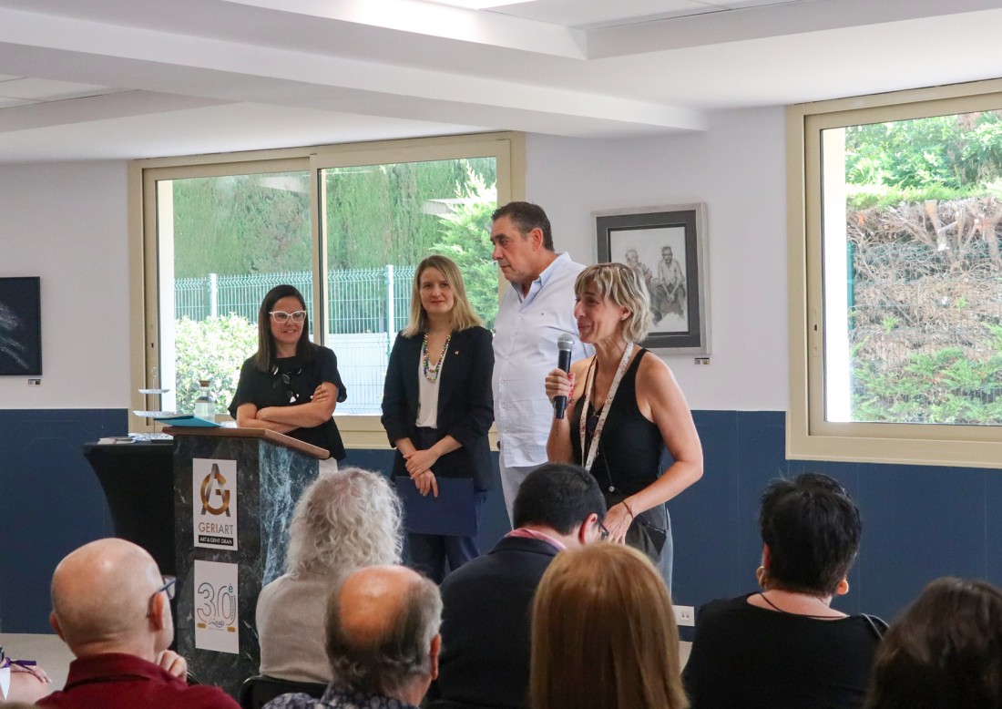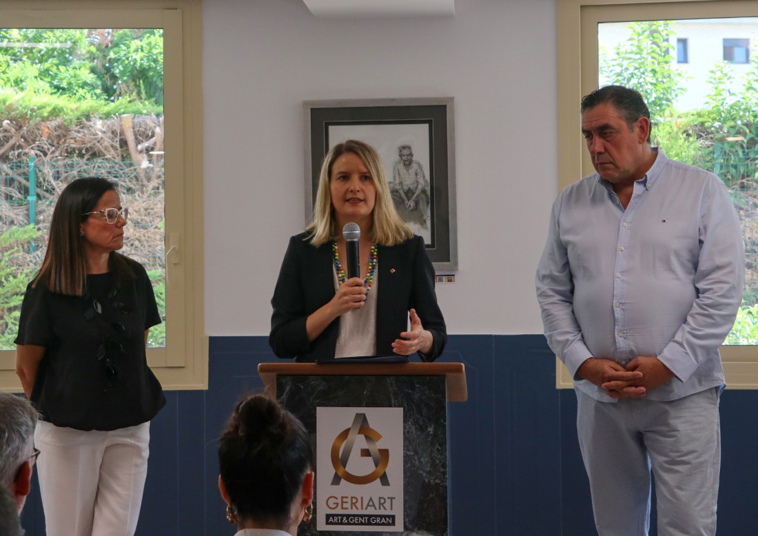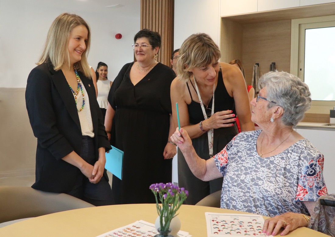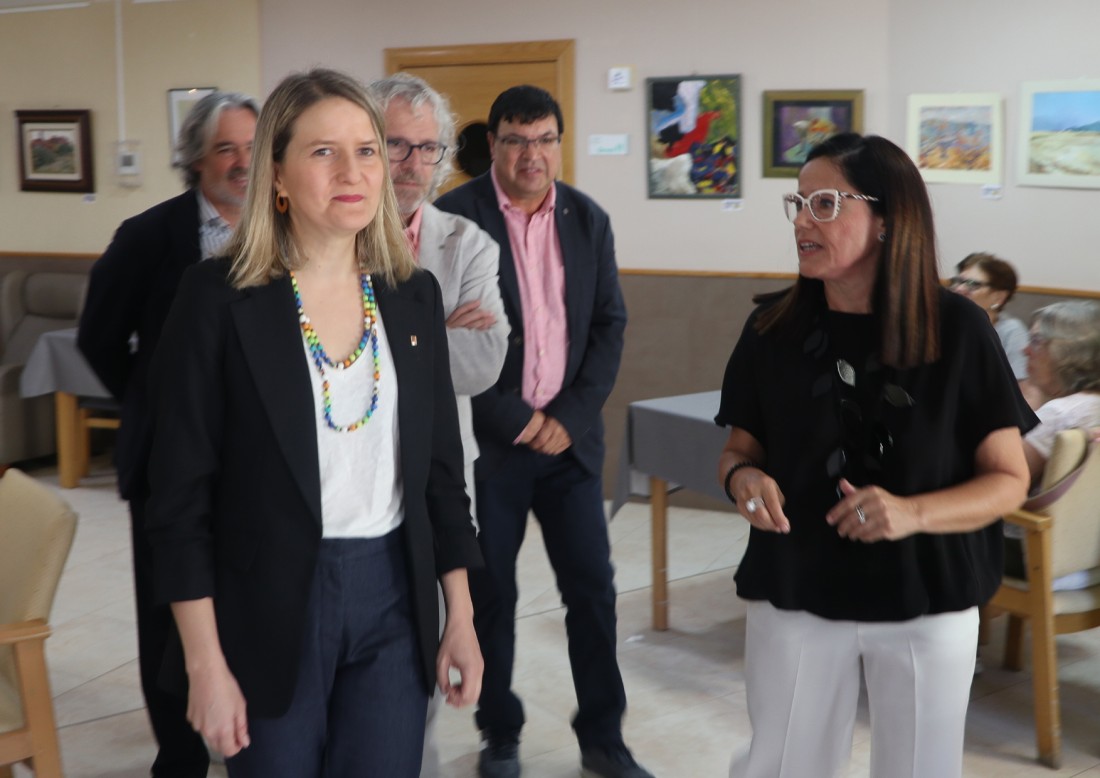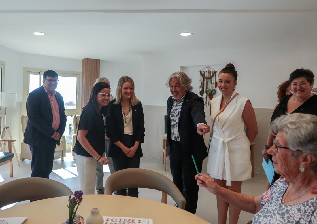 La visita, que se ha iniciado a las 10 de la mañana, ha recorrido las cuatro plantas del centro, empezando por la cuarta y descendiendo hasta la primera, donde se han realizado los parlamentos institucionales en la sala polivalente. Durante el recorrido, la consellera pudo conocer de cerca las unidades de convivencia para grupos reducidos, las habitaciones remodeladas y las amplias terrazas terapéuticas, diseñadas para favorecer la libertad de movimientos y la seguridad de las personas residentes. También ha visitado los proyectos GeriArt, la exposición de pintura que fomenta la creatividad y la reminiscencia, y Gallinae, la granja educativa del centro.